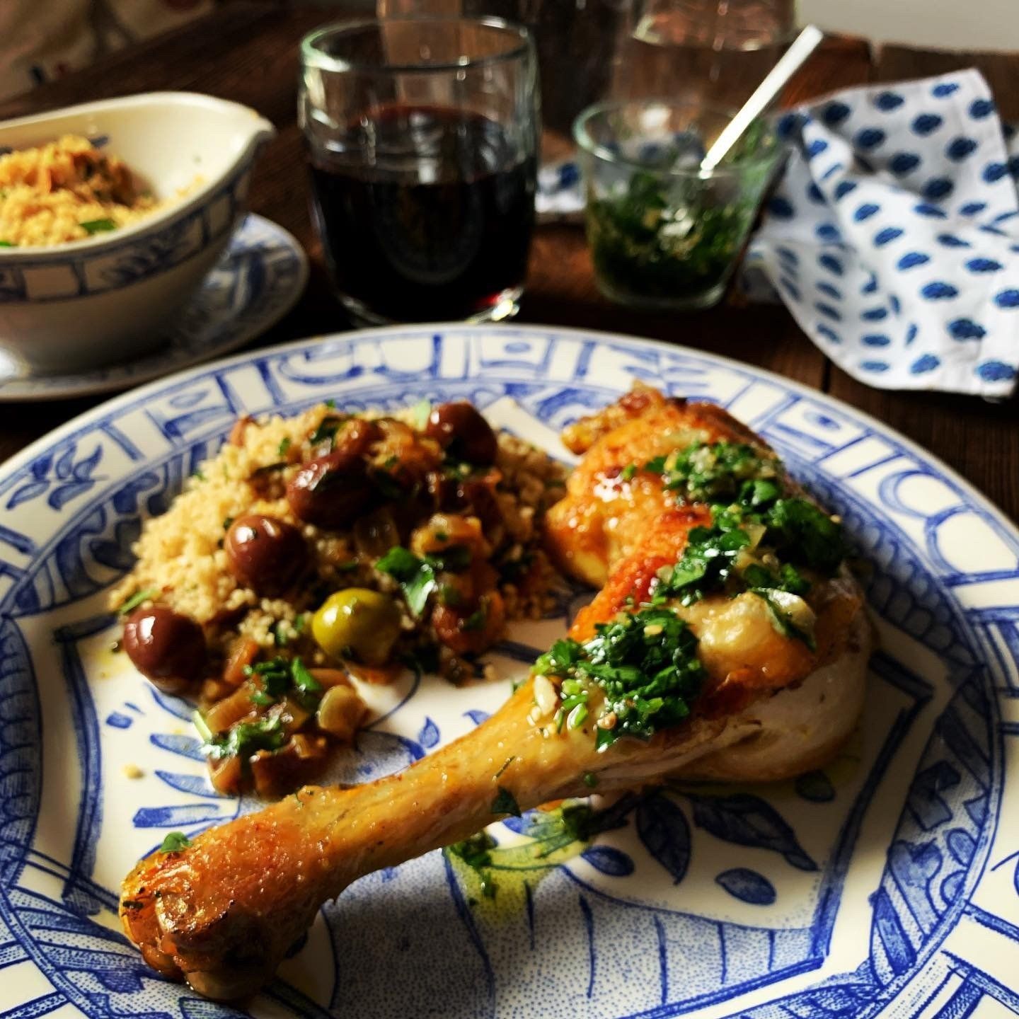 Marokkanische Küche zur Vorlage: Label Rouge Huhn mit Salzzitrone und Oliven, Couscous mit Ras el Hanout, Kreuzkümmel, Mandeln und Datteln sowie Petersilie und Minze und Chermoula mit Salzzitrone, Sesam-Salz, Olivenöl DOP, Petersilie und Koriander. Das dauerte zwar in der Vorbereitung, aber es schmeckt soooo verdammt lecker!