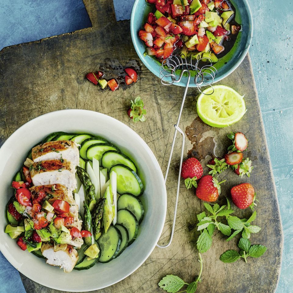 Beim frischen Frühlingssalat mit Spicy Chicken stehen alle Zeichen auf Frühling: Avocado, Bärlauch, Erdbeeren und Spargel werden mit Wildkräutern zu einem wunderbaren Salat vereint.