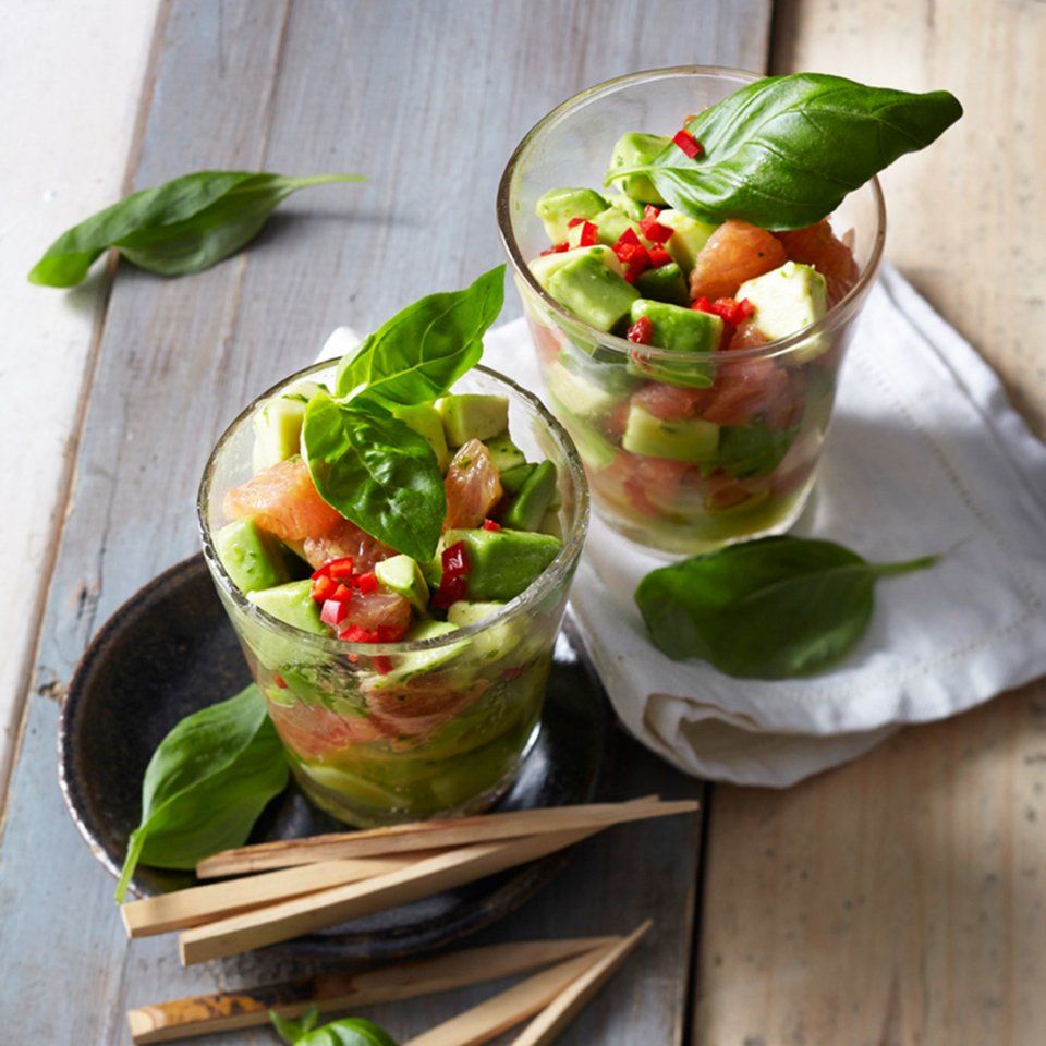 Erfrischend und pikant schmeckt der cremige Avocadosalat mit Grapefruit und Chili . Das Dressing wird nur mit Zitronensaft, kalt gepresstem Olivenöl sowie etwas Salz und Pfeffer angemacht. Etwas frischen Basilikum vor dem Servieren dazu - fertig!