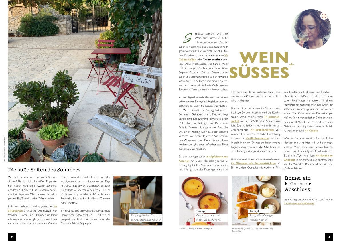 Bei der Kombination mit Speisen kann man auf die Grundregeln vertrauen: „süß mit süß“/„süß mit scharf“/ „süß mit fettig“/„süß mit salzig“. Es gilt einzig die persönlichen Geschmacksvorlieben herauszufinden und die süßen Weine immer gekühlt (8 bis 9°C) zu servieren. Schön kalt passen sie wunderbar zu Apéroplatten.