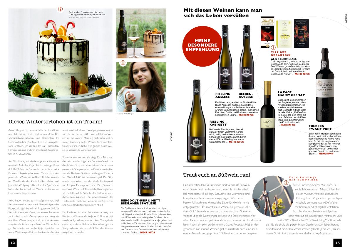 Laut der offiziellen EU-Definition sind Weine als Süßwein oder Dessertwein zu bezeichnen, wenn ihr Zuckergehalt bei mindestens 45 g/l liegt. Süßweine sind vollmundig und komplex und besitzen eine ausgeprägte Süße, der im besten Fall auch eine ebensolche Säure für die Harmonie entgegensteht. Das macht diese Weine, die gerne als „flüssiges Gold“ bezeichnet werden, zu wunderbaren Speisebegleitern über die Darreichung zu Käse und Dessert hinaus. Vor allem Kabinettweine, Spätlesen, Auslesen, Beeren- und Trockenauslesen haben ein sehr großes unterschätztes Potenzial. Neben den genannten natursüßen Weinen gibt es zusätzlich noch eine spannende Auswahl an „gespriteten“ Süßweinen, zu denen beispielsweise Portwein, Sherry, Vin Santo, Banyuls, Madeira oder Malaga zählen. Bei diesen Weinen wird die alkoholische Gärung durch Zugabe hochprozentigen Alkohols gestoppt, was süße Weine mit höherem Alkoholgehalt entstehen lässt.