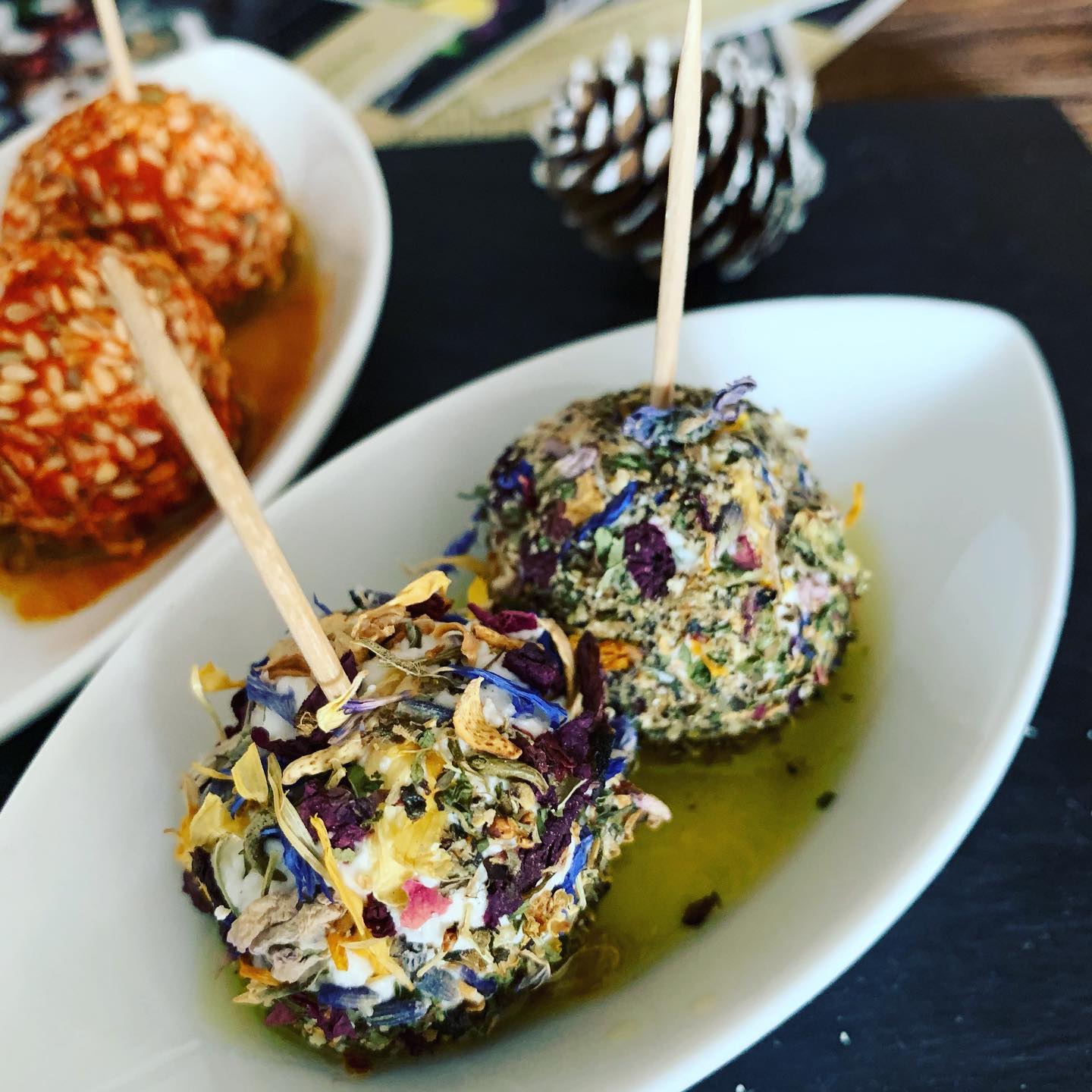 Den Ziegenfrischkäse mit einer Gabel fein zerdrücken und mit Salz abschmecken. Dann mit einem Teelöffel kleine Nocken ausstechen und zu kleinen Kugeln in den Handflächen rollen.