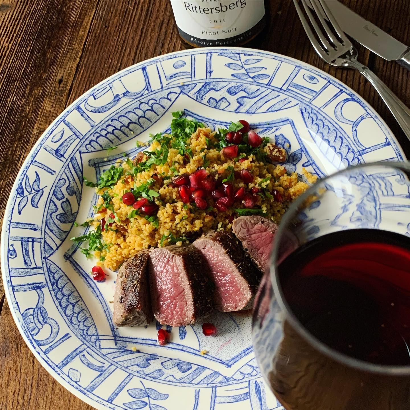 Getränkeempfehlung: Pinot Noir aus dem Elsass. Ich hatte einen von meinen Freunden, Domaine Jean-Paul Schmitt, die ihre Weinberge seit vielen Jahren biodynamisch bewirtschaften. Das Tannin des Pinot Noirs setzte einen wunderbaren Kontrapunkt zur Süße des Couscous-Salates und so konnte der elegante Pinot Noir zum zarten Lamm glänzen.