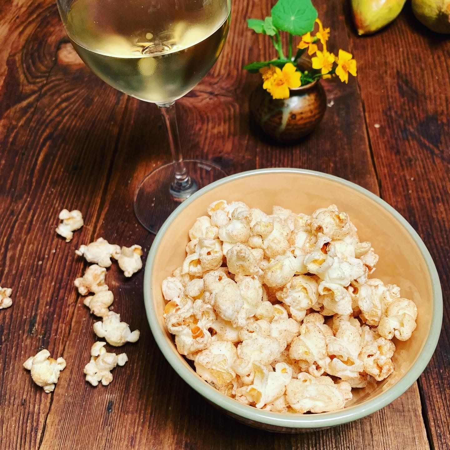 Heute Abend habe ich es mir auf dem Sofa gemütlich gemacht. Zum TV-Programm, zu den Diskussionen auf Twitter und zum Glas großartigem Gewürztraminer sind die frisch gemachten Popcorn der perfekte Snack. Dazu habe ich eine Hälfte „gesüßt“ mit Zucker, Zimt und Ingwerpulver und außerdem noch etwas Ahornsirup darüber geträufelt. Für die andere Hälfte habe ich den Zucker zunächst karamellisieren lassen und dann die Popcorn darin gewendet.