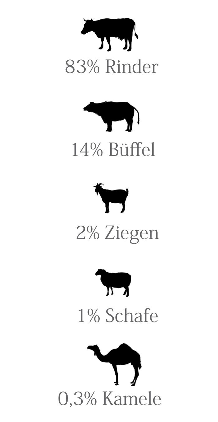 Die weitweite Milchproduktion nach Nutztierarten (2016/ FAO).