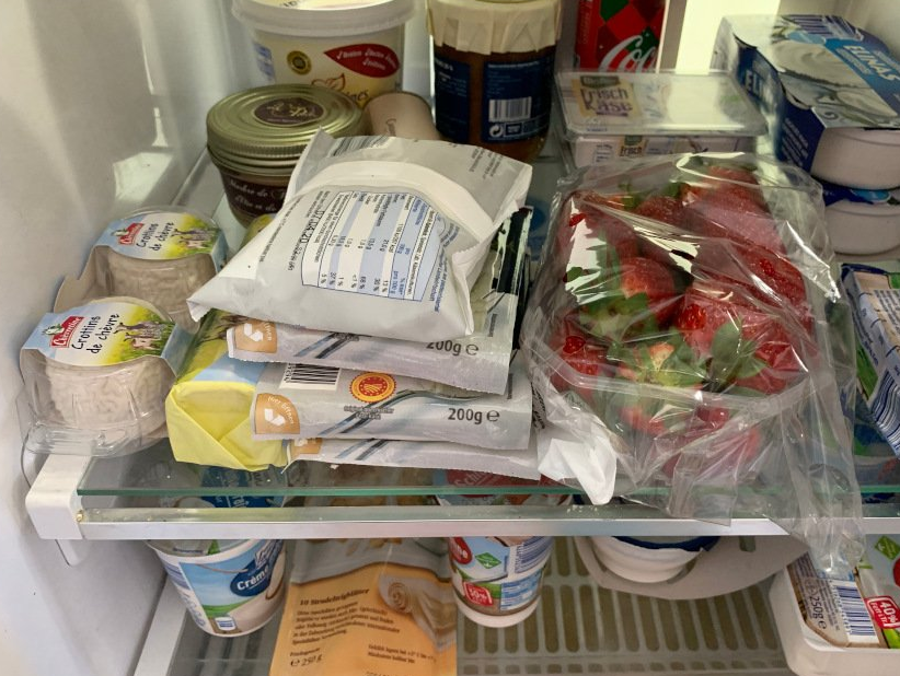 Was bereits im Kühlschrank war: Ziegenkäse (2 Crottin und eine Ziegenkäserolle), Feta (3 Packungen) und noch 1 Bio-Mozzarella. Hinzukommen Naturjoghurt (ausreichend viele), Crème fraîche (2 Becher) und Sahne (2 Becher), eine Packung geräucherte Forellenfilets und 1 Pack aufgeschnittener Leberkäse, sowie eine 10er Packung Bio-Eier.
