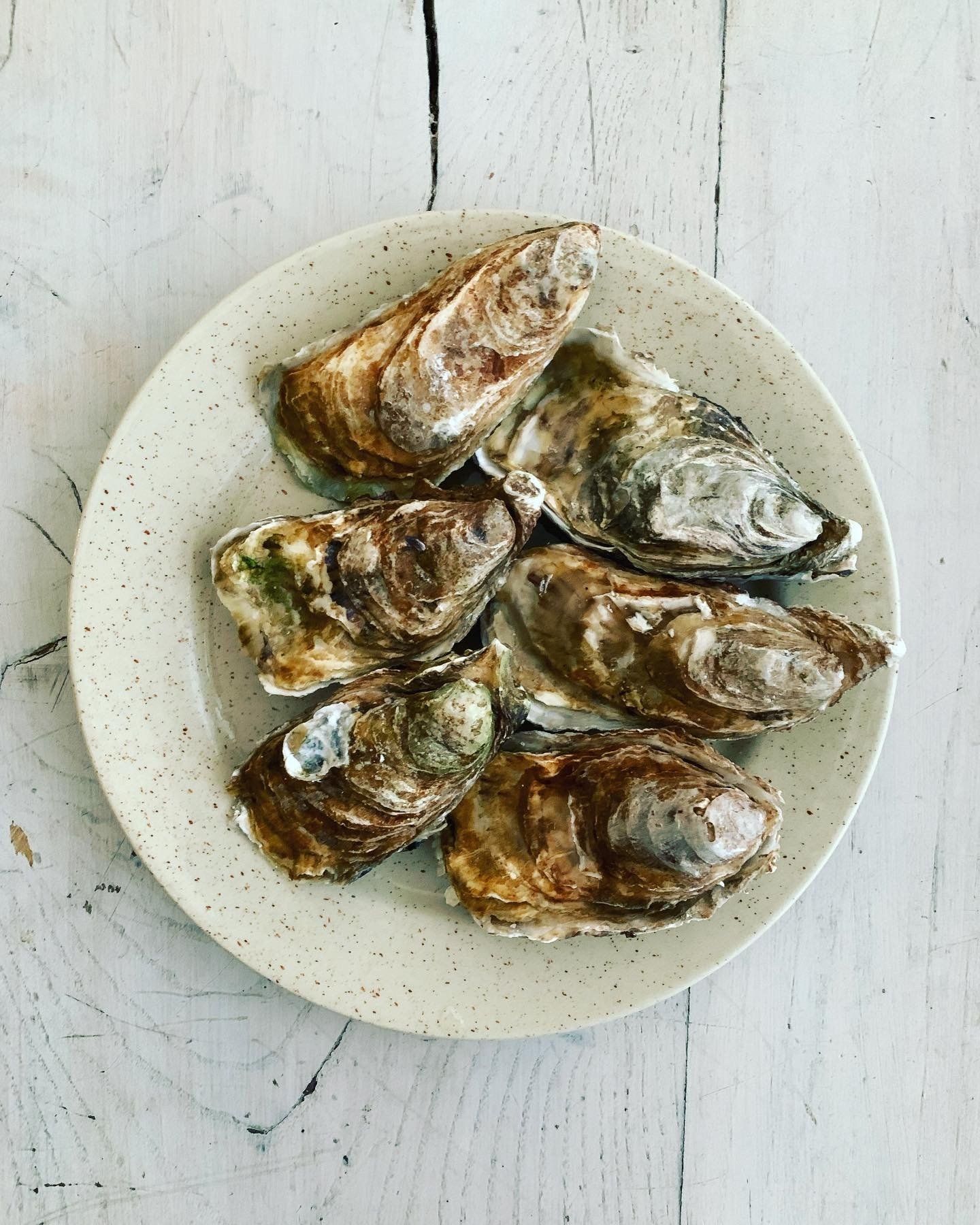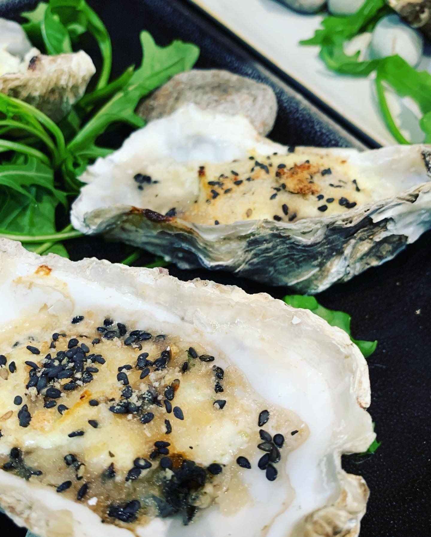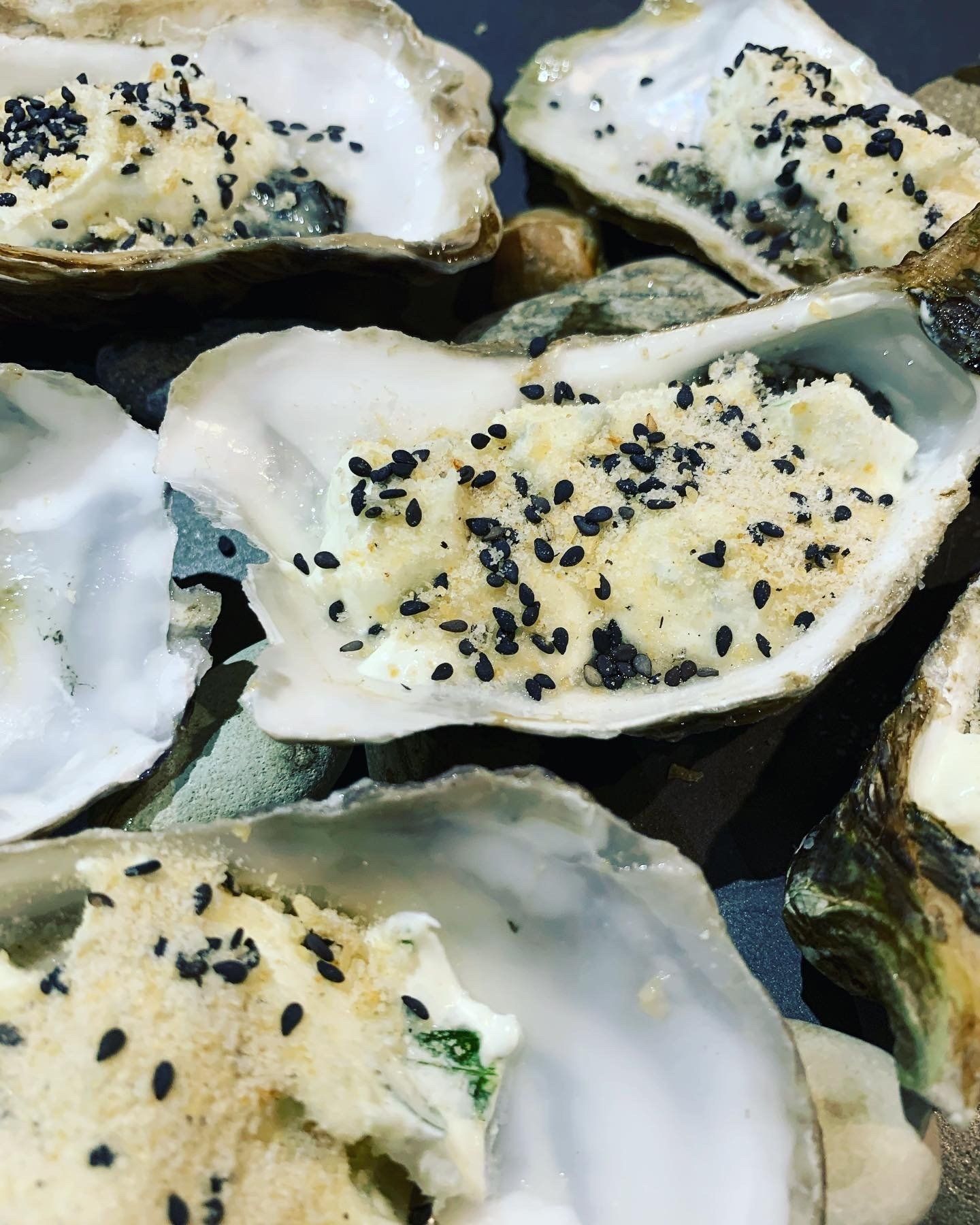 6-8 frische Austern (wir hatten Huitres creuses de Cancale No.2), 4 EL französische Crème double, 1 Zweig Estragon, 1 Prise Salz und einer feinen Panade aus Brotbröseln und schwarzem Sesam. Dazu ein paar Blättchen Rucola mit Christelles selbst gemachtem Kombucha-Essig.
