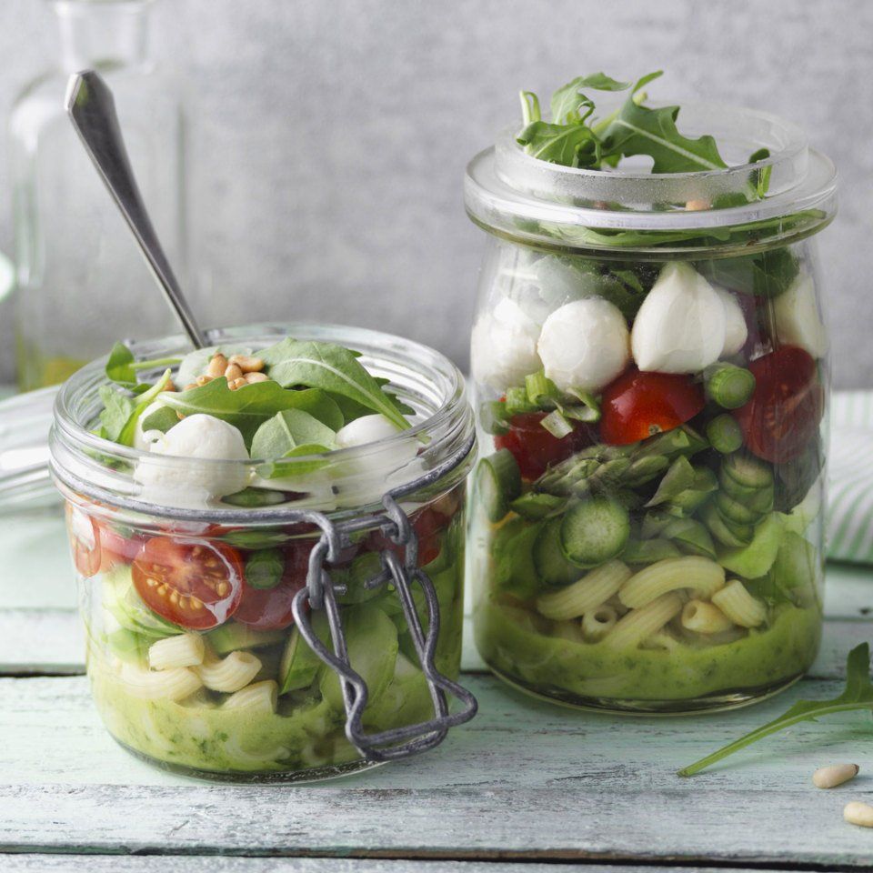 Einwecken war gestern, heute wird geschichtet! Statt Zwetschgen, Quitten und Co. kommen jetzt jede Menge knackige Salate und feine Süppchen ins Glas – und dann für die gesunde Pause mit ins Büro. Das Prinzip ist ganz einfach: Dressing und Zutaten Schicht für Schicht ins Glas, Deckel drauf und ab in den Kühlschrank. So bleibt bis zum nächsten Morgen alles topfrisch und kann direkt im Glas mit ins Büro. Zur Mittagspause den Schichtsalat einmal durchmischen – guten Appetit! Und die Suppen-Zutaten im Glas einfach mit kochendem Wasser aufgießen, umrühren, fertig. Was zunächst vielleicht nach schlechtem Fastfood klingt, ist im Gegenteil gesundes Fitfood: Durch die perfekte Kombination der Zutaten steckt der Lunch voller wertvoller Nährstoffe. Und das gibt Ihnen die nötige Energie, das berühmte Nachmittagstief mit Schwung zu meistern.