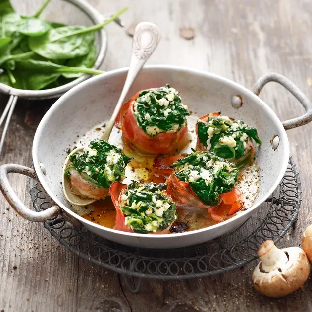 Den Rahmspinat in einem Topf langsam erwärmen, einmal kurz aufkochen lassen. Spinat mit Salz, Pfeffer und frischgeriebenem Muskat abschmecken und in die Filoteig-Körbchen verteilen.